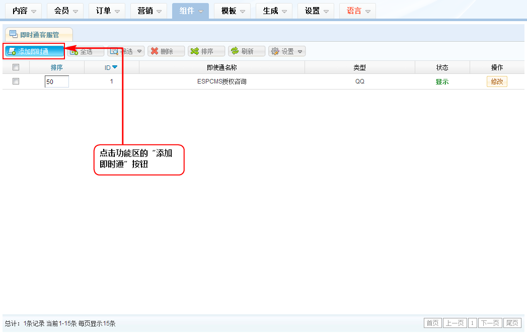 2、在即时通客服列表区,点击功能区的“添加即时通”按钮;