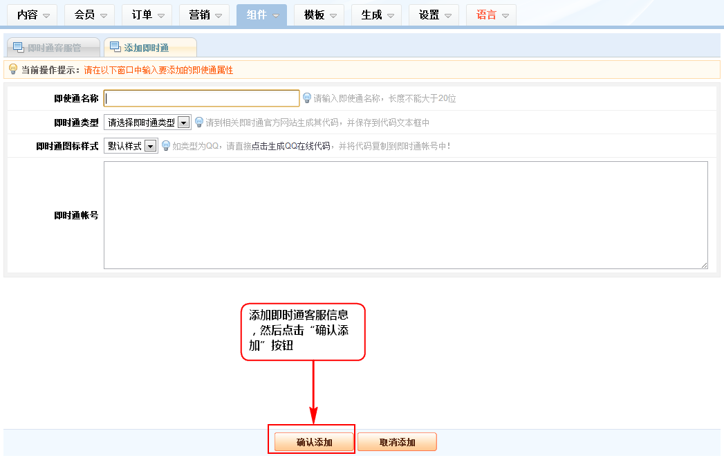 3、在出来的即时通客服添加窗口中,添加即时通客服信息,然后点击“确认添加”按钮。