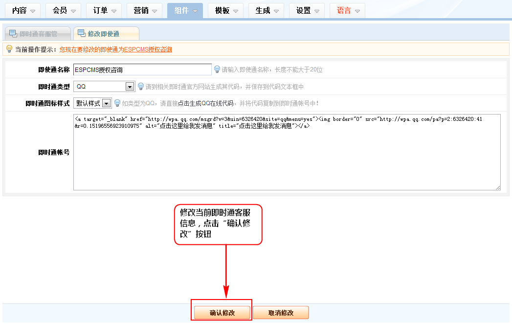 3、在出来的即时通客服修改窗口中,修改当前即时通客服信息,点击“确认修改”按钮。