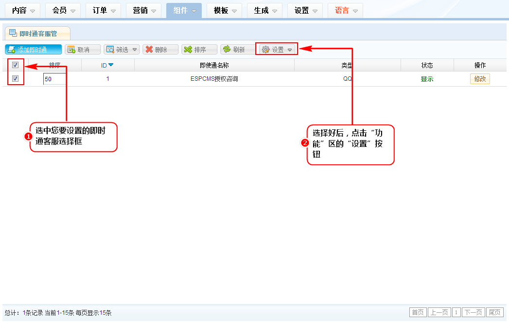 2、在即时通客服列表区,选中您要设置的即时通客服选择框,选择好后,点击“功能”区的“设置”按钮,在弹开的设置菜单中,选择相应的设置功能。