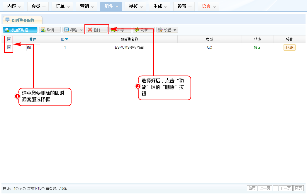 2、在即时通客服列表区,选中您要删除的即时通客服选择框,选择好后,点击“功能”区的“删除”按钮。