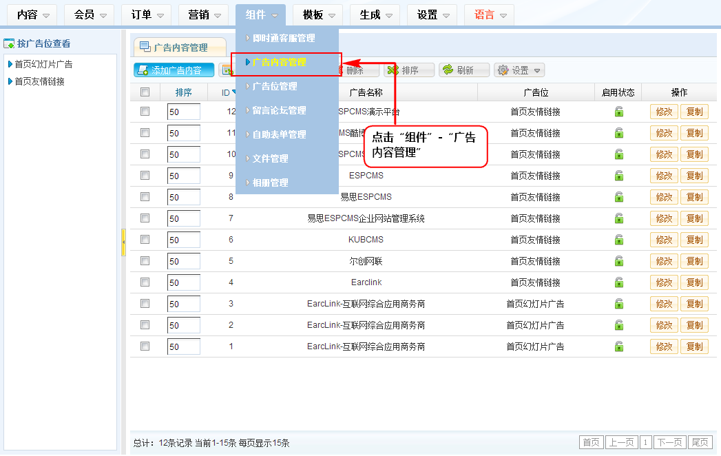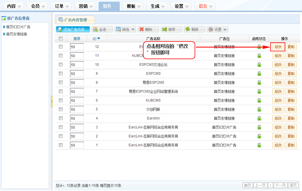 2、在广告列表区双击您要修改的广告,或者点击相对应的“修改”按钮即可。