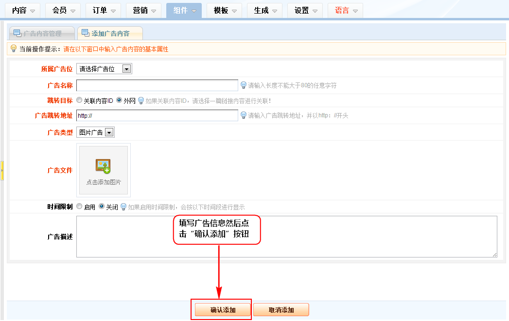 3、在出来的广告内容添加窗口中,填写广告信息然后点击“确认添加”按钮。