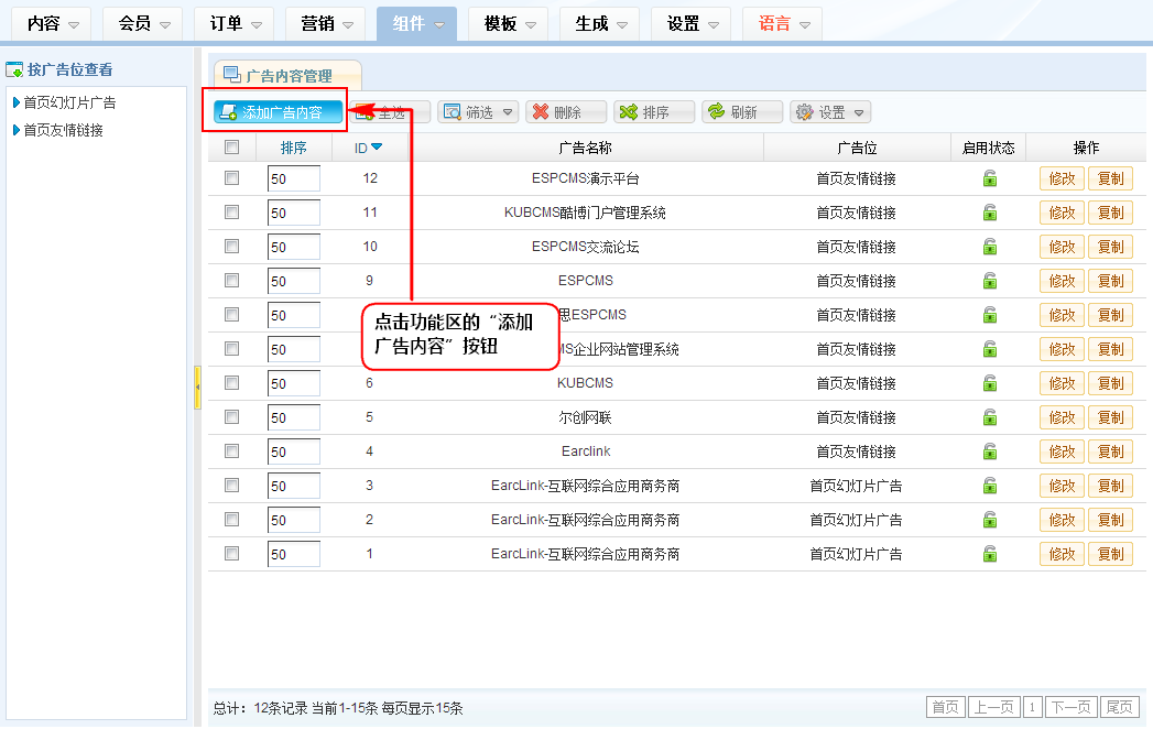 2、在广告列表区,点击功能区的“添加广告内容”按钮;
