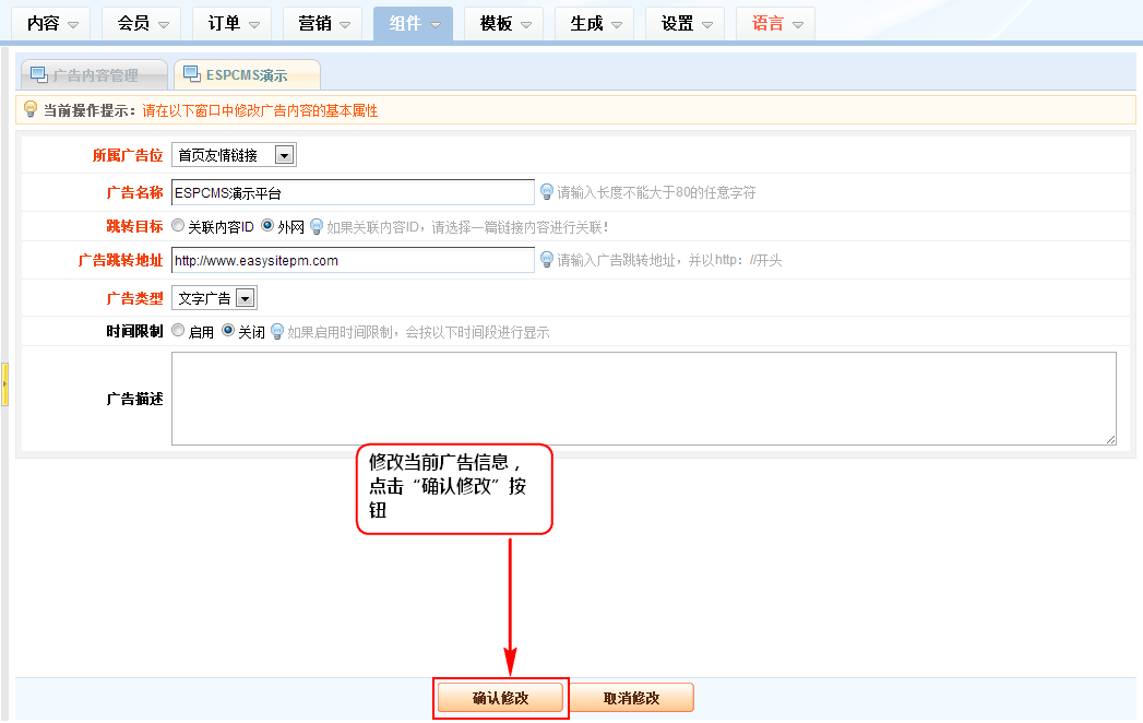 3、在出来的广告内容修改窗口中,修改当前广告信息,点击“确认修改”按钮。