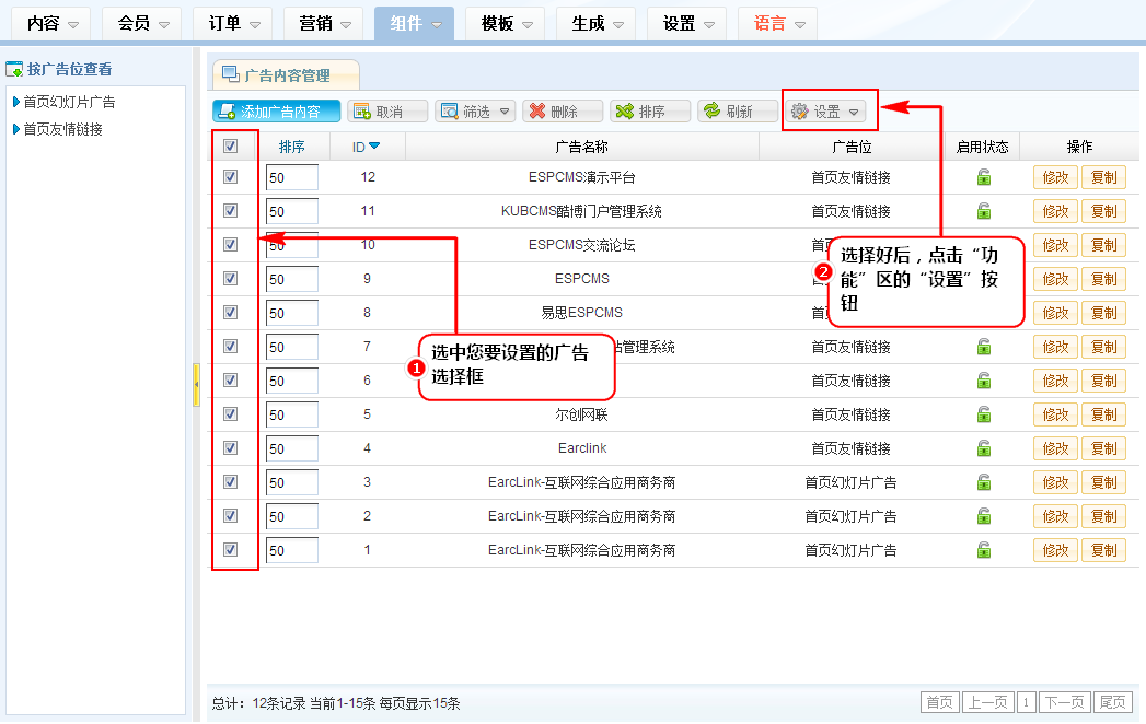 2、在广告列表区,选中您要设置的广告选择框,选择好后,点击“功能”区的“设置”按钮,在弹开的设置菜单中,选择相应的设置功能。