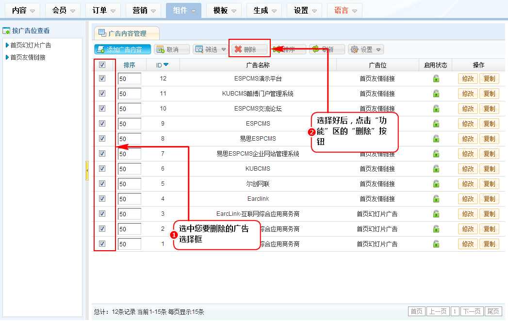 2、在广告列表区,选中您要删除的广告选择框,选择好后,点击“功能”区的“删除”按钮。