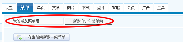 2、添加一级菜单先在左侧选择一个菜单组,右侧显示该组导航菜单;按“在当前分组添加一级菜单”,然后在下面新增的菜单项目里修改名称和链接指向,链接指向可以是各模块的首页或指定任何外部或内部网址。