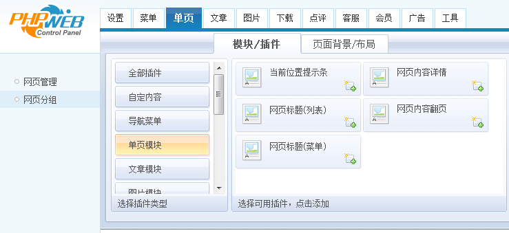 然后在插件管理面板中选择单页模块,在第二栏中选择插入网页内容详情插件如果当前组有多个页面,可以选择插入网页标题列表或网页内容翻页插件,实现菜单式切换或翻页切换,也可以同时插入以上两项。