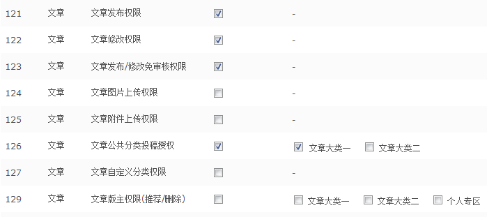 文章发布权限、文章修改权限、文章发布修改免审核权限、公共分类投稿权限、文章图片上穿权限、自定义分类权限;