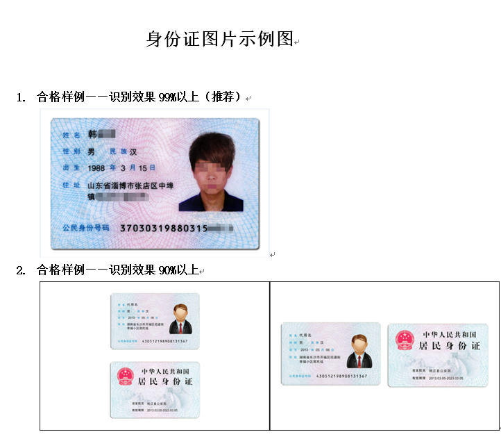 2. 建议身份证图片保证完整,避免裁剪边角框、有污迹、划痕或折痕。