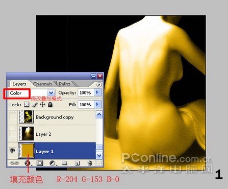 | 1、新建一个PSD文件,将两幅图片素材分别放入两个独立的图层中。在两个素材层之下新建一个新层,以暗黄色(颜色值:R=204、G=153、B=0)。将图层的混合模式设置为“色彩”。 |