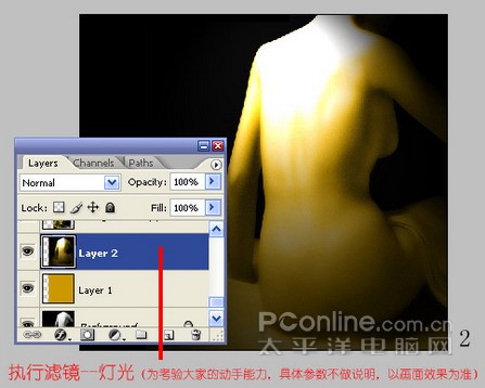 | 2、对素材2执行“滤镜-灯光”,达到下图所示的效果。具体的参数笔者在这里就不透露了,考验一下大家的动手能力。 |