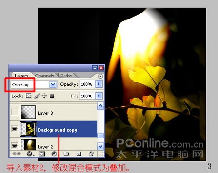 | 3、将素材2的图层混合模式改为“叠加”(Overlay)。 |