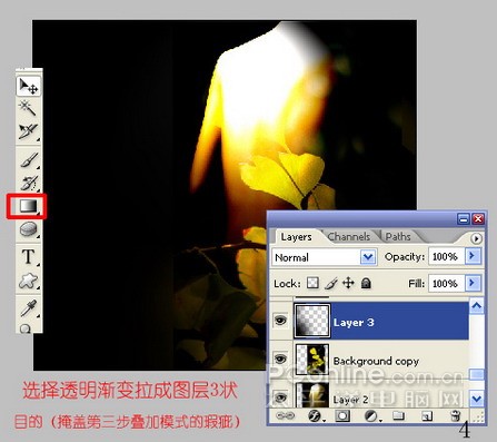 | 4、新建一个图层,选择黑色透明度渐变,效果如下图所示。这个步骤可以用来改善第三步叠加模式更改产生的瑕疵。 |