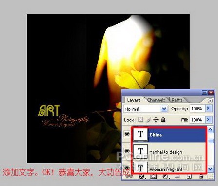 | 5、我们再新建三个文字图层,输入文字,选择好字体、色彩并排列好位置关系,如下图所示。 |