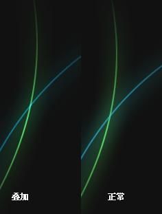 | 8.我们按照前面的方法做一条蓝色的曲线光束。与之前那条绿的交*。这时我把没有添加叠加图层的图放在旁边对比一下,你就能看出来区别了。有叠加图层的交*部分更“亮”一些,这就是我们需要的细节。 |