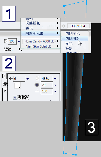 | 11.如图,先分成小步: 1.先对这个路径添加内侧阴影滤镜。 2.在滤镜设置里选中“去底色”选项。 3.得到这样的结果。 |