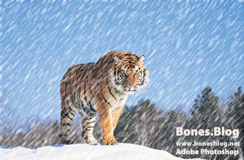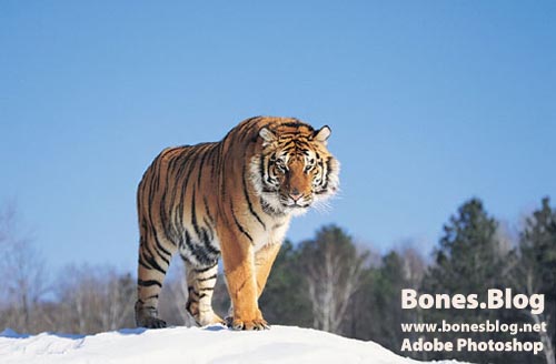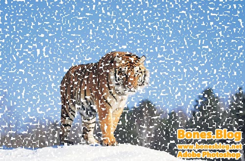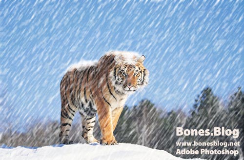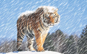 | 9、使用将前景色设定为白色,使用画笔在“老虎”的背上进行绘制,可以得到积雪的效果。 |