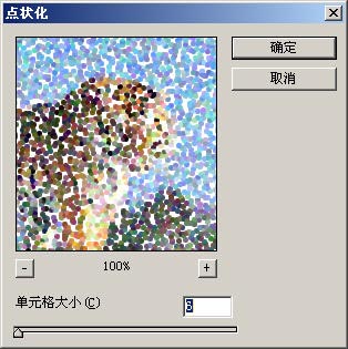 | 2、将背景图层进行复制,执行“滤镜>像素化>点状化”命令,在弹出的“点状化”对话框中设定如下图所示。在这里“单元格大小”的设定决定了雪片的大小。 |