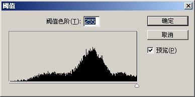 | 4、 执行“图像>调整>阈值”命令,在“阈值”对话框中设定如下图所示。在这里,“阈值色阶”的大小,决定了雪花的多少。 |