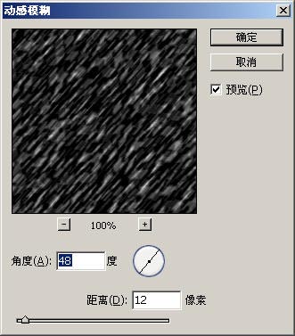 | 7、 执行“滤镜>模糊>动感模糊”命令,在“动感模糊”对话框中设定飘雪的方向(角度)和飘雪的速度(距离)。 |