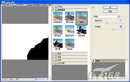 | 2、保留选区,在蒙版中填充黑色。执行菜单栏中的“滤镜”“画笔描边”“喷溅”命令,在打开的对话框中设置喷色半径和平滑度都为10,效果如图02所示。 |