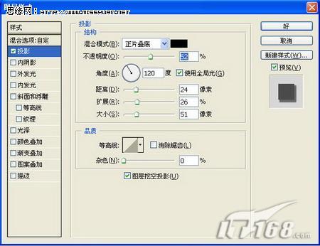| 3、由于是在蒙版中执行命令,图像观察不到效果,双击图层1,在弹出的图层样式对话框中选择“投影”样式,设置如图03所示,画面效果如图04所示。 |