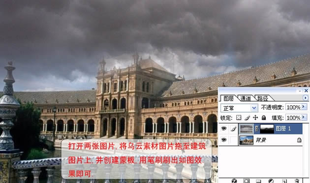 1、打开原图和素材图,将乌云素材图片拖至在原图片上,并创建蒙版,用画笔刷出如效果即可。