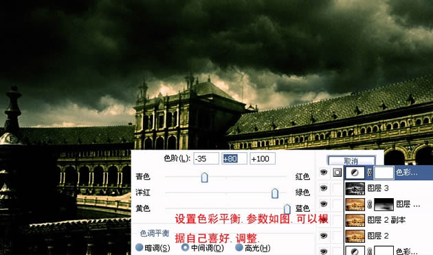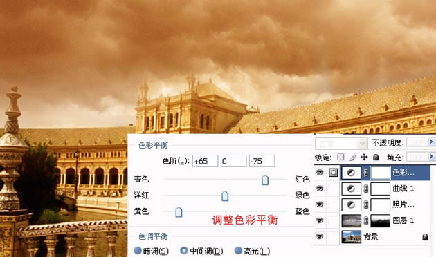 4、点击图层——新调整图层——色彩平衡,如下图设置: