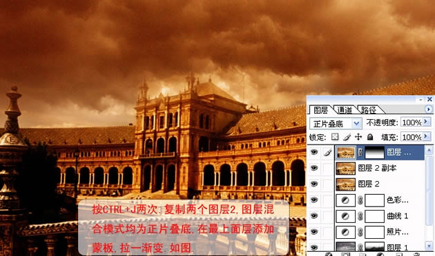 6、按CTRL+J两次,复制两个图层,图层2和图层2副本,两个图层混合模式均为正叠底,在最上面添加蒙版,拉一个渐变,如下图: