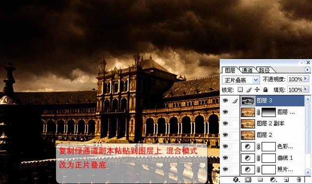 8、复制绿通道副本粘贴到图层上,混合模式改为正片叠底。如下图: