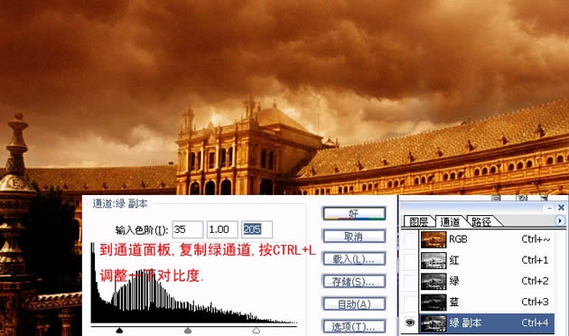 7、点击通道面板,复制绿通道,按CTRL+l调出色阶,调整一下对比度,如下图设置: