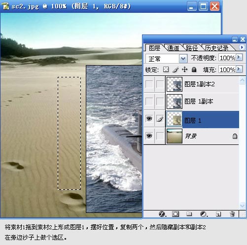 | 1、将素材1拖到时素材图2上形成图层1,摆好位置,复制两个,然后隐藏副本和副本2,在旁边沙子上做个选区,如下图: |