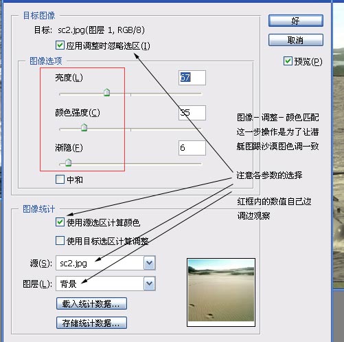 | 2、点击图像——调整——颜色匹配,这一步操作是为了让潜艇图跟沙漠图色调一致,注意:各参数的选择,红框内的数值自己边调边观察,如下图: |
