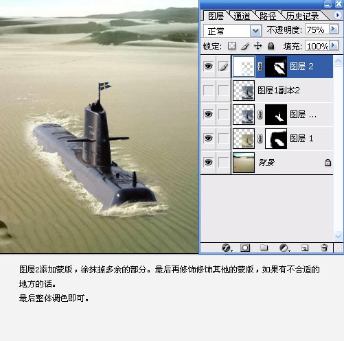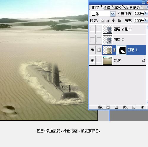 | 3、给图层1添加蒙版,涂出潜艇,浪花要保留。如下图: |