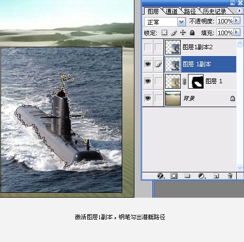 | 4、激活图层1副本,用钢笔工具勾出潜艇路径,如下图: |