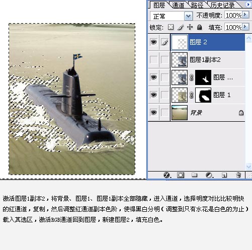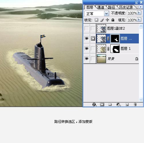 | 5、把潜艇路径转换选区,添加蒙版,如下图: |
