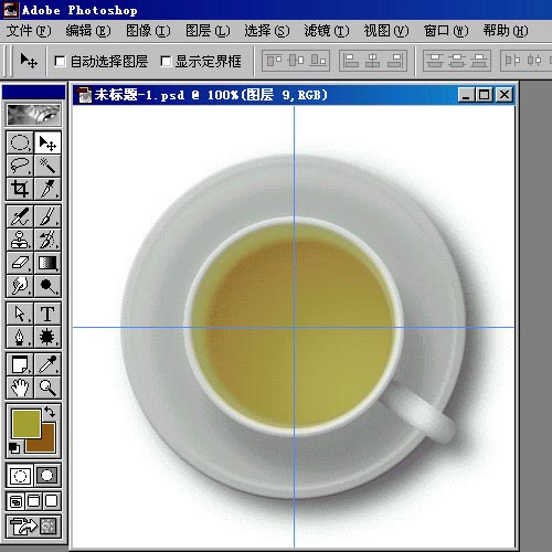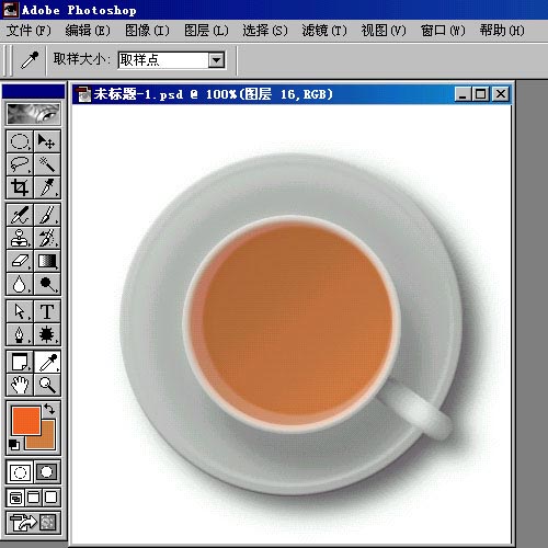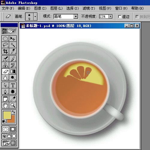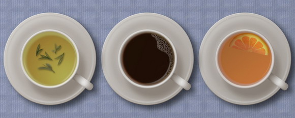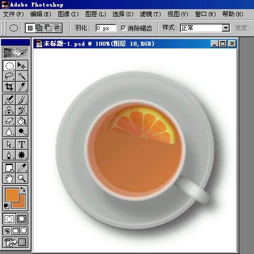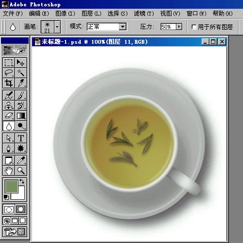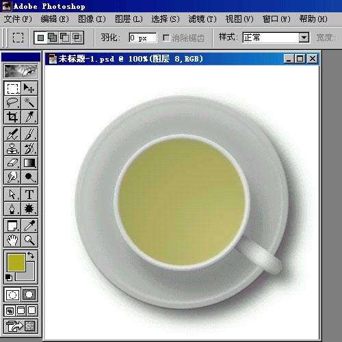 | 14.新建一层画高光,方法是画正圆,羽化后填充白色,收缩几个像素后删除,再用橡皮檫,调整不透明度。茶叶是用钢笔钩出形状,填充浅绿色,然后用加深和减淡工具涂抹出明暗,这个没什么技巧,需要的是耐心和感觉。 |