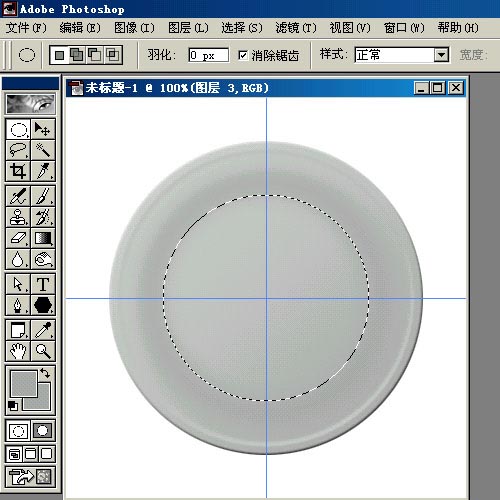 | 4.新建一层,由中心拉个比第2层小些的圆,羽化10,填充35%灰色,取消选择,再由中心拉出个比刚才小些的圆,也是羽化10,删除。这几步的正圆形选区都是重新画的,而不用收缩,因为收缩会变形,数量越大,次数越多,变形也就会越厉害。 |