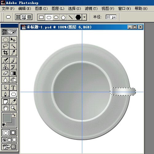 | 8.再在下面建一层画杯柄。选择圆角矩形工具,半径约10像素,在水平参考线的位置拉出个圆角矩形,填充线性渐变。渐变色可设为:灰(140/140/140)—白(245/245/245)—灰(145/145/145)。 |