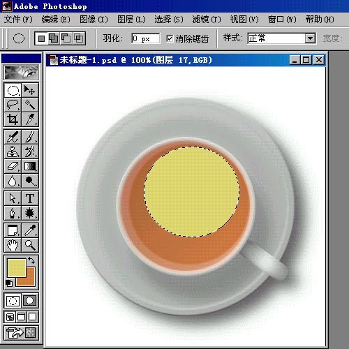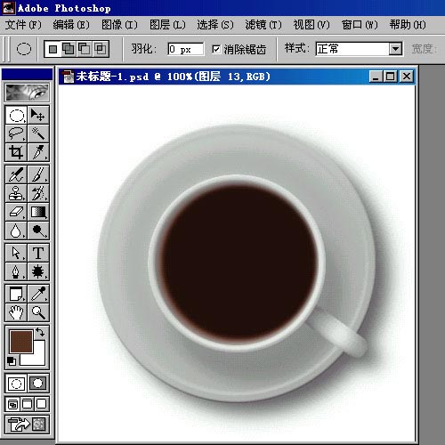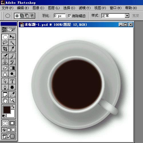 | 15.收起清茶图层组并隐藏,新建图层组,命名“咖啡”。新建一层,载入杯口内沿的选区,收缩2像素,略向左上移动,羽化1,填充深褐色(32/15/5)。 |