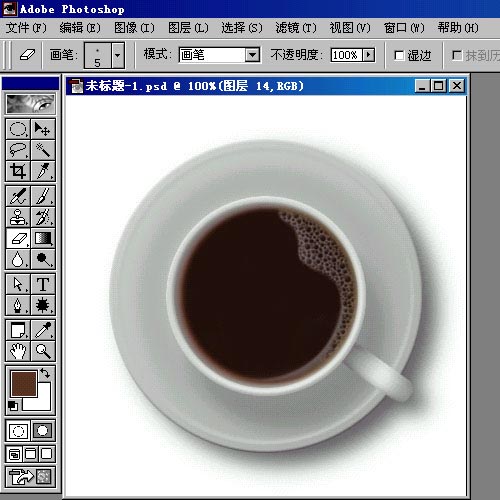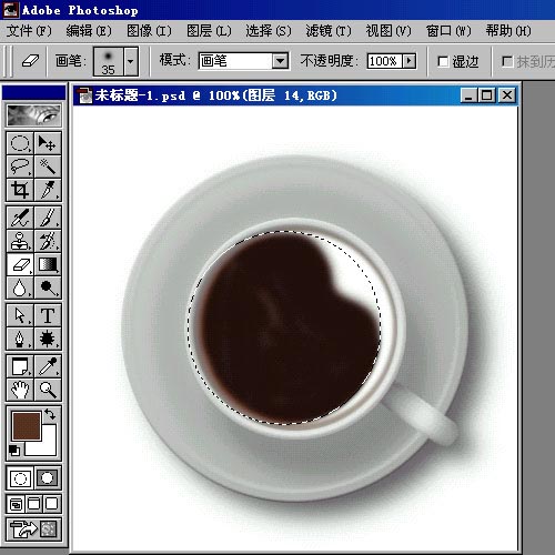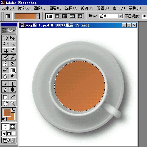 | 16.在下面建一层,载入杯口内沿选区,羽化2,填充(85/50/31),降低不透明度为45%。这一层是作为咖啡映在杯身内的颜色。 |