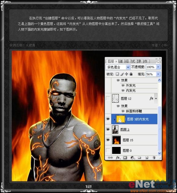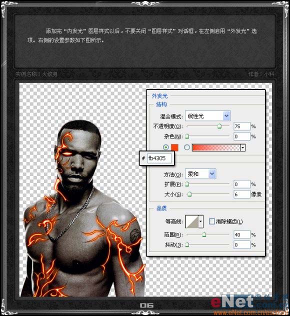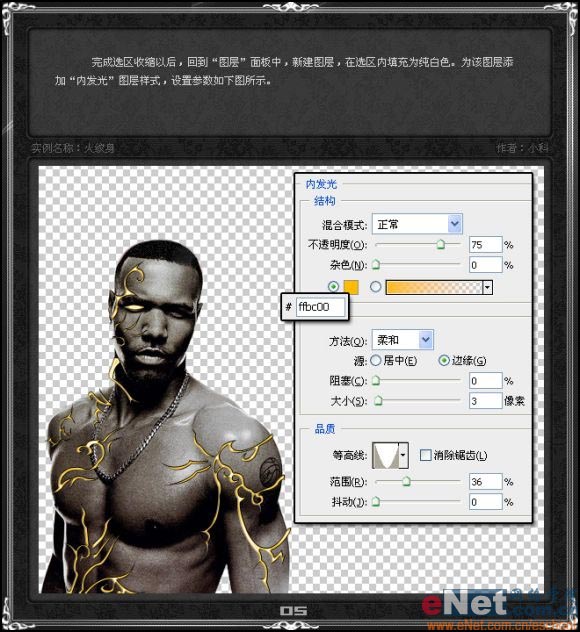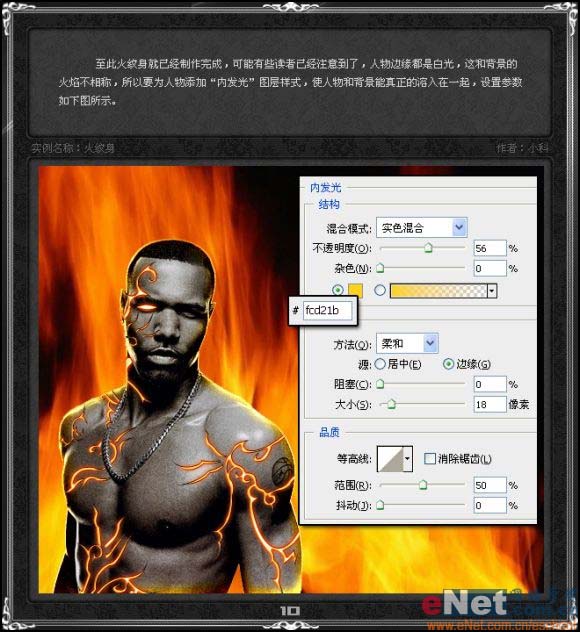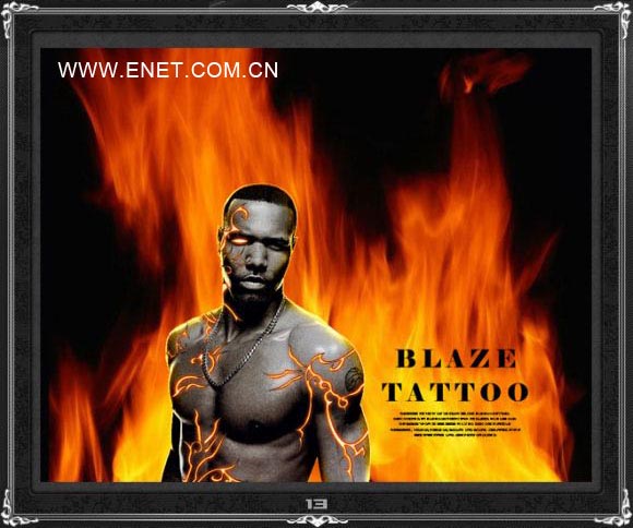 | 10、至此火纹身就己经制作完成,可能有些讲习者己经注意到了,人物边缘都是白光,这和背景的火焰不相称,所经要为人物添加“内发光”图层样式,使人物和背景能真正的溶入在起,设置参数如下图所示。 |