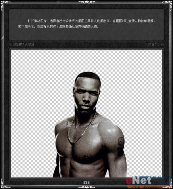 | 1、打开素材图片,选择自己比较拿手的抠图工具将人物抠出来,在抠图时注意使人物轮廓圆滑,如下所示,在选择素材时,最好要强壮感觉很酷的人物。 |