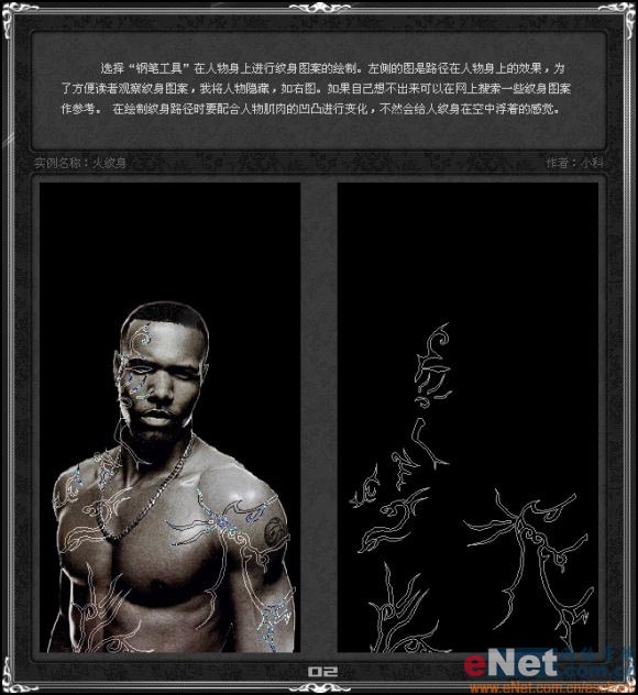 | 2、选择“钢笔工具”在人物身上进行纹身图案的绘制,左侧的图是路径在人物身上的效果,为了方便读者观察纹身图案,我将人物隐藏,如右图,如果自己想不出来可以在网上搜索一些纹身图案作参考,在绘制纹身,路径时要配合人物肌肉的凹凸进行变化,不然会给人物纹身在空中浮着的感觉。 |