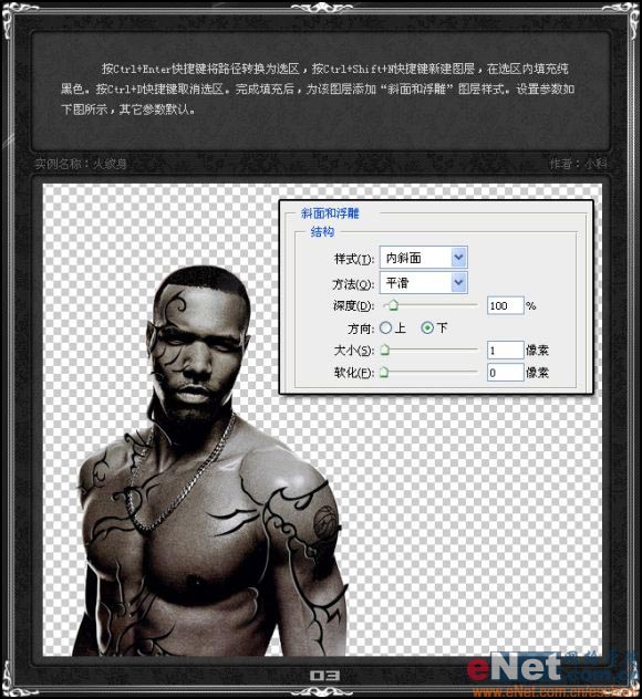 | 3、按“ctrl+Enter”快捷键将路径转换为选区,按“ctrl+Shift+N”快捷键新建图层,在选区内填充纯黑色,按“ctrl+D”快捷键取消选区,完成填充后,为该图层添加“斜面和浮雕”图层样式,设置参数如下图所示,其它参数默认。 |