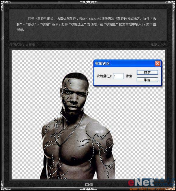 | 4、打“路径”面板,选择纹身路径,按“ctrl+Enter”快捷键再次将路径转换成选区,执行“选择”-“修改”-“收缩”命令,打开“收缩选区”对话框,在“收缩量”的文本框中输入1像素,如下图所示。 |