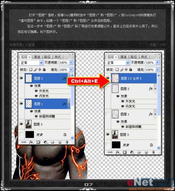 | 7、打开“图层”面板,按着Ctrl键同时选中“图层1”和“图层2”,按ctrl+Alt+E快捷键,执行“盖印图层”命令,创建一个“图层1”和“图层2”合并后的图层,在这一步中“图层1”和“图层2”除了再进行效果调整以外,基本上己经没有什么用了,所示现在将它隐藏,如下图所示。 |