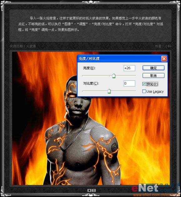 | 8、导入一张火焰背景,这样才能更好的衬托火纹身的效果,如果感觉上一步中火纹身的颜色有点红,不够亮的话,可以执行“图像”-“调整”-“亮度/对比度”命令,打开“亮度/对比度”对话框,将“亮度”调亮一点,效果如图所示。 |